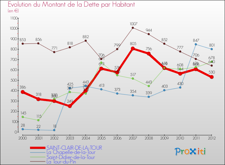 A Saint-Clair-de-la-Tour, la dette par habitant a donc augmenté de 37.31 % entre 2000 et 2012.