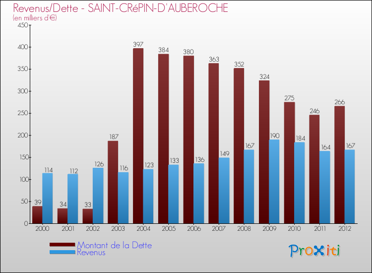 Comparaison Revenus/Dette de Saint-Crépin-d'Auberoche (de 2000 à 2012)