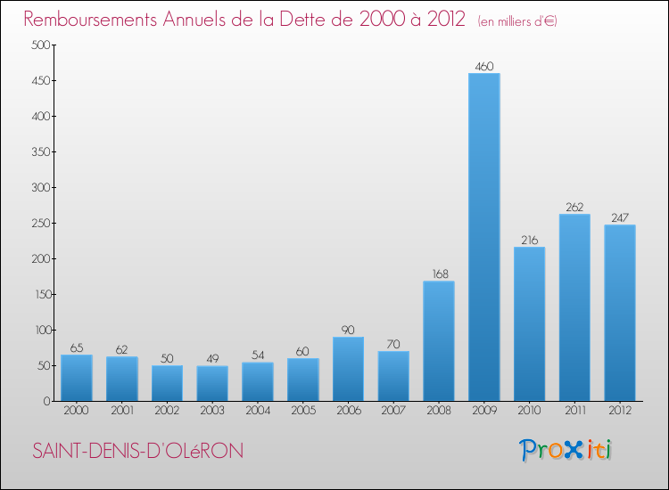 Par rapport aux 1374 habitants de Saint-Denis-d'Oléron, en 2012 le poids de cette dette représente 1637 € par habitant.