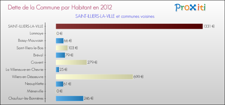 A Saint-Illiers-la-Ville, la dette due par habitant de la commune en 2012 est donc plus élevée de 167.27 % que pour des communes similaires.