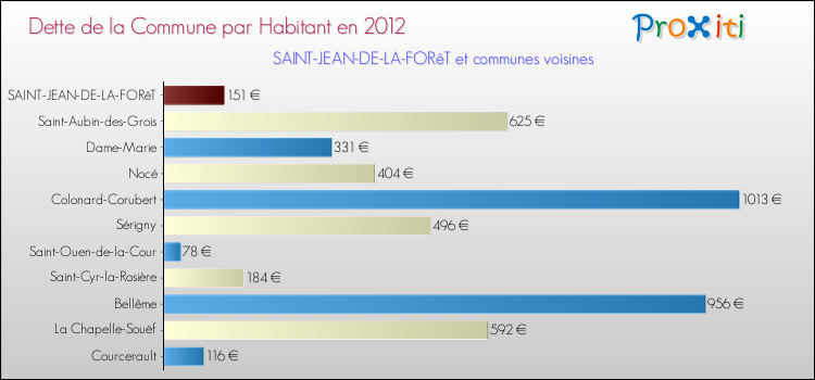 A Saint-Jean-de-la-Forêt, la dette due par habitant de la commune en 2012 est donc moins élevée de 70.1 % que pour des communes similaires.