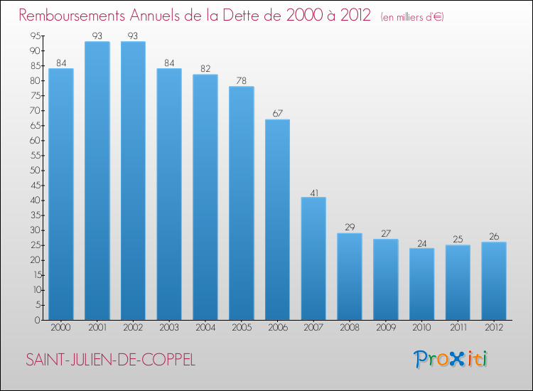 A Saint-Julien-de-Coppel, la dette par habitant a donc baissé de 87.46 % entre 2000 et 2012.