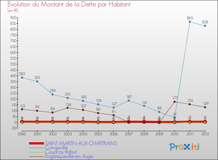 A Saint-Martin-aux-Chartrains, la dette par habitant a augmenté de 66.67 % entre 2008 et 2012.