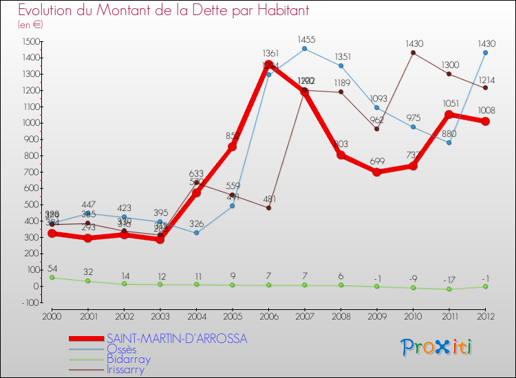 A Saint-Martin-d'Arrossa, la dette par habitant a donc augmenté de 211.11 % entre 2000 et 2012.