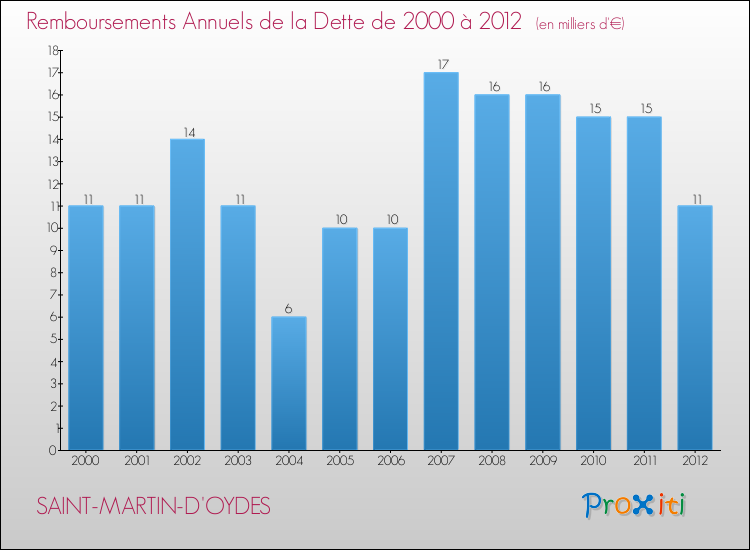 A Saint-Martin-d'Oydes, ce montant de la dette est pourtant en baisse de 13.04 % par rapport à 2011.