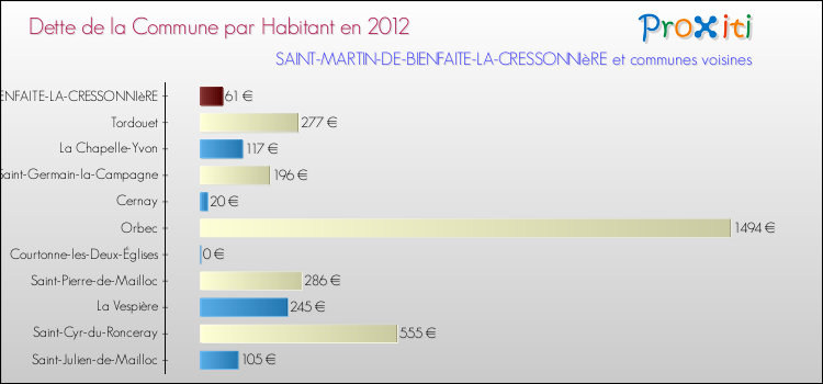 A Saint-Martin-de-Bienfaite-la-Cressonnière, la dette due par habitant de la commune en 2012 est donc moins élevée de 87.75 % que pour des communes similaires.
