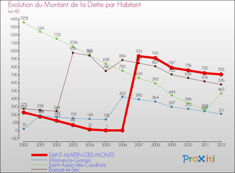 Pendant la même période, les communes françaises similaires à Saint-Martin-des-Monts, ont vu leur dette par habitant augmenter de 43.47 % en moyenne entre 2000 et 2012.