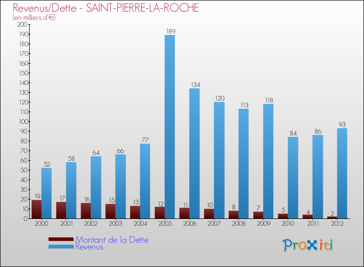 Comparaison Revenus/Dette de Saint-Pierre-la-Roche (de 2000 à 2012)