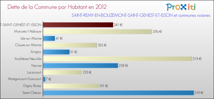 A Saint-Remy-en-Bouzemont-Saint-Genest-et-Isson, la dette due par habitant de la commune en 2012 est donc moins élevée de 63.43 % que pour des communes similaires.