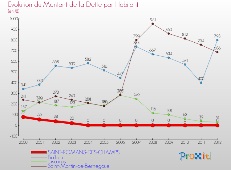 A Saint-Romans-des-Champs, la dette par habitant a donc baissé de 100 % entre 2000 et 2012.