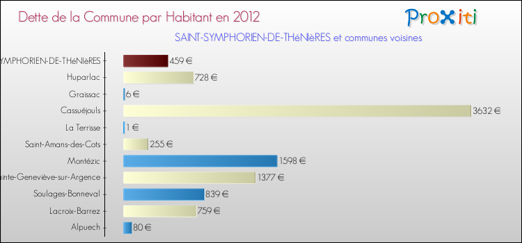 Par rapport aux 251 habitants de Saint-Symphorien-de-Thénières, en 2012 le poids de cette dette représente 459 € par habitant.