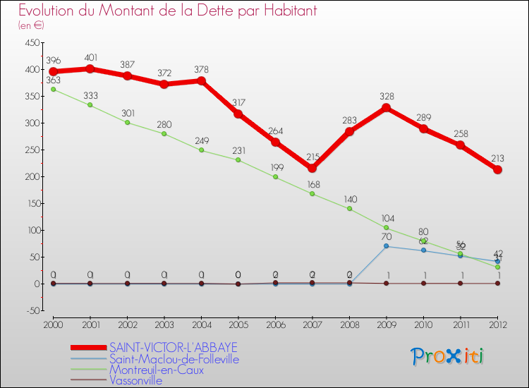 A Saint-Victor-l'Abbaye, la dette par habitant a donc baissé de 46.21 % entre 2000 et 2012.
