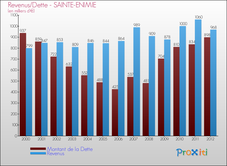 Comparaison Revenus/Dette de Sainte-Enimie (de 2000 à 2012)