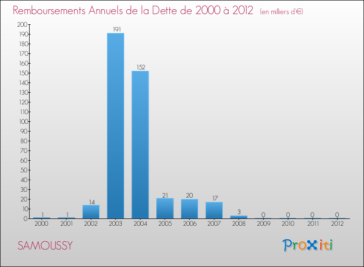 Par rapport aux 361 habitants de Samoussy, en 2012 le poids de cette dette représente 398 € par habitant.
