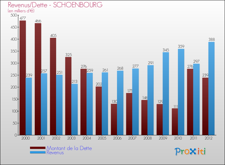 Comparaison Revenus/Dette de Schoenbourg (de 2000 à 2012)