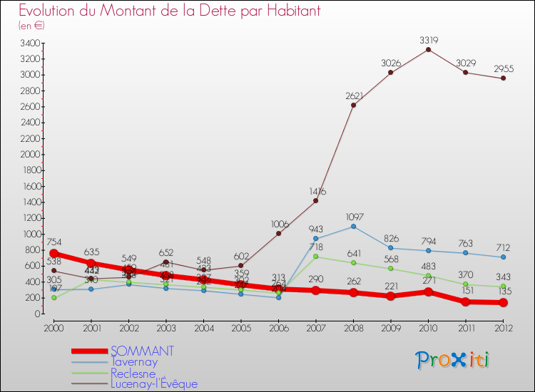 A Sommant, la dette par habitant a donc baissé de 82.1 % entre 2000 et 2012.