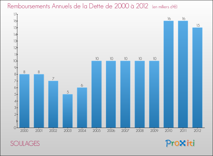 A Soulages, la dette due par habitant de la commune en 2012 est donc moins élevée de 7.72 % que pour des communes similaires.