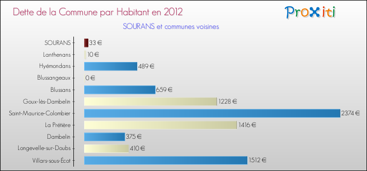 A Sourans, la dette due par habitant de la commune en 2012 est donc moins élevée de 93.47 % que pour des communes similaires.