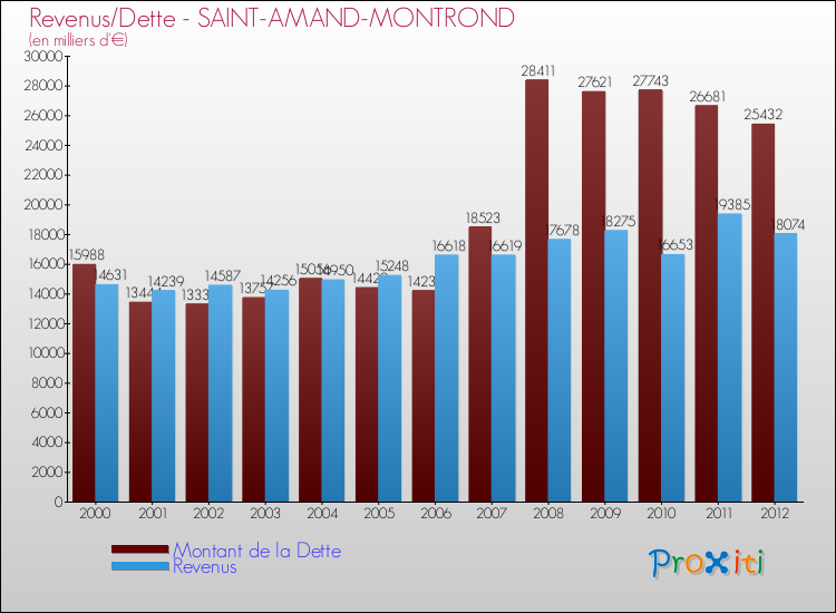 Comparaison Revenus/Dette de Saint-Amand-Montrond (de 2000 à 2012)