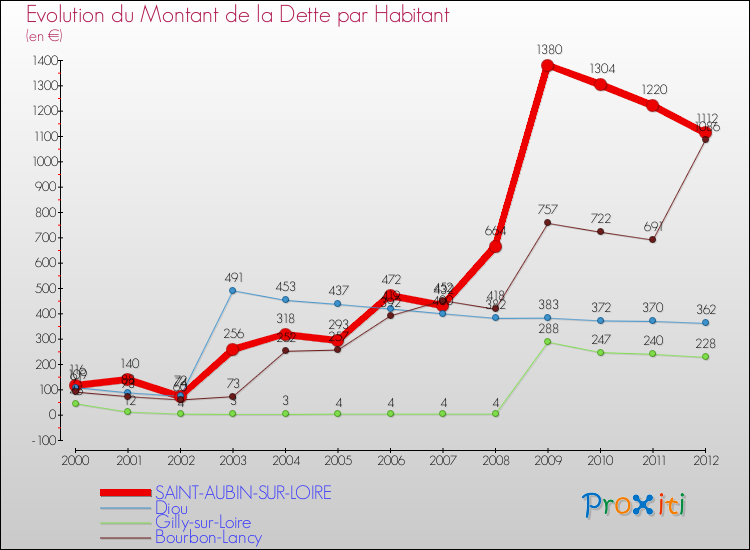 Par rapport aux 317 habitants de Saint-Aubin-sur-Loire, en 2012 le poids de cette dette représente 1112 € par habitant.