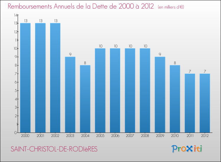 A Saint-Christol-de-Rodières, la dette par habitant a donc baissé de 76.87 % entre 2000 et 2012.