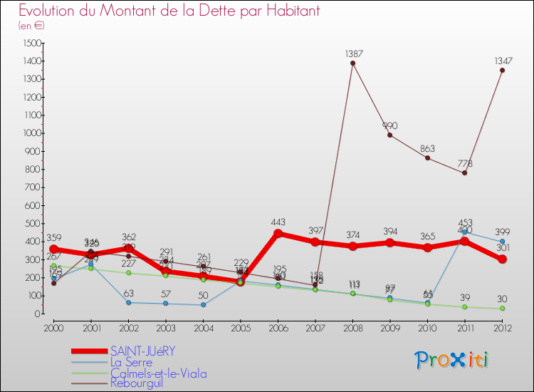 Pendant la même période, les communes françaises similaires à Saint-Juéry, ont vu leur dette par habitant augmenter de 16.63 % en moyenne entre 2000 et 2012.