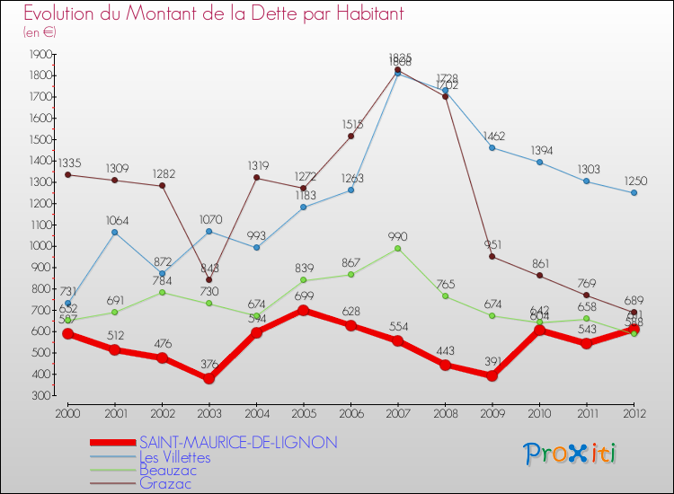 A Saint-Maurice-de-Lignon, la dette par habitant a donc augmenté de 4.09 % entre 2000 et 2012.
