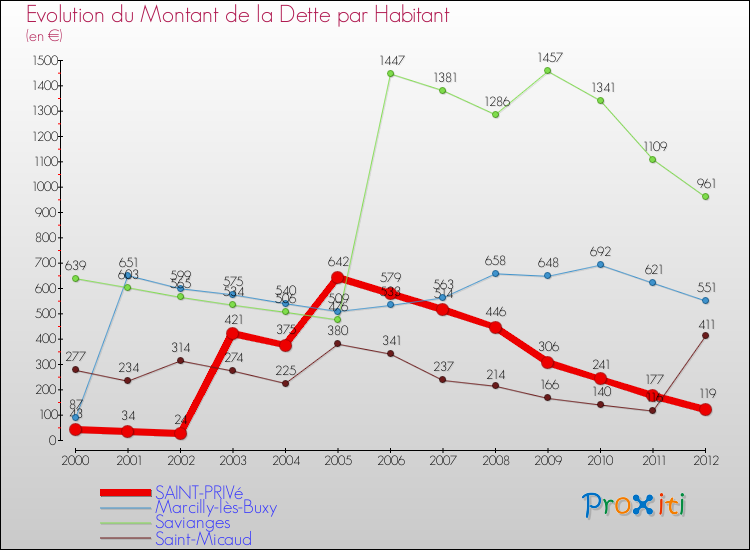 Pendant la même période, les communes françaises similaires à Saint-Privé, ont vu leur dette par habitant augmenter de 25.8 % en moyenne entre 2000 et 2012.