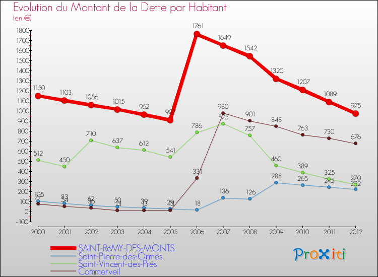 A Saint-Rémy-des-Monts, la dette par habitant a donc baissé de 15.22 % entre 2000 et 2012.
