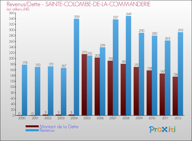 Comparaison Revenus/Dette de Sainte-Colombe-de-la-Commanderie (de 2000 à 2012)