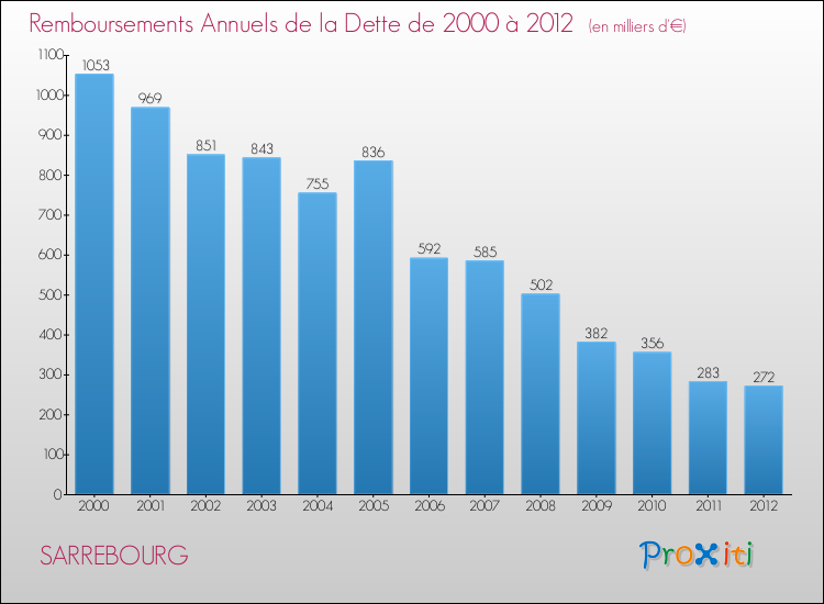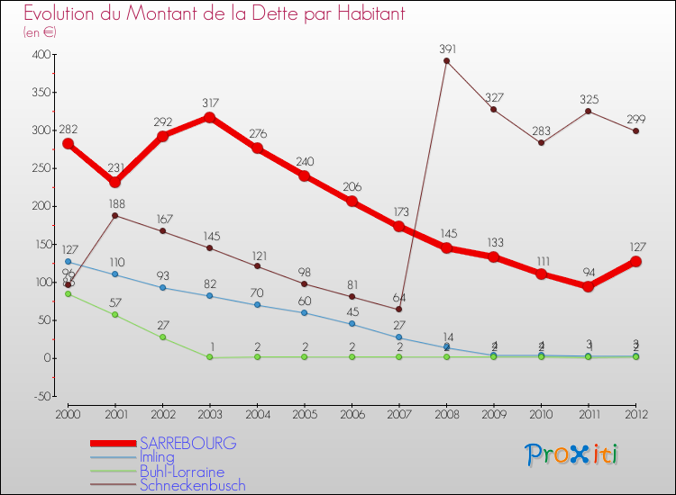 A noter : la valeur moyenne de la dette par habitant des communes françaises similaires à Sarrebourg était de 972 € par habitant, en 2012.