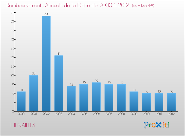 Par rapport aux 262 habitants de Thenailles, en 2012 le poids de cette dette représente 189 € par habitant.