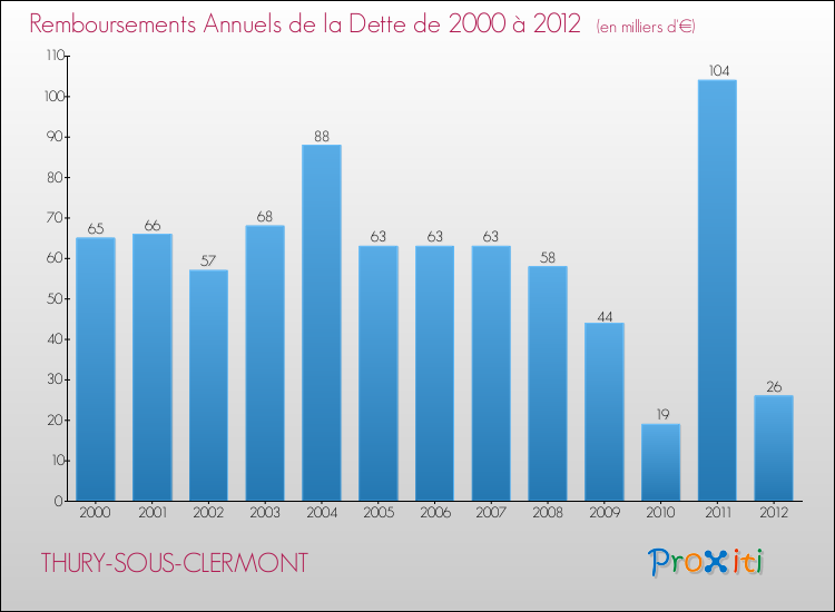 A Thury-sous-Clermont, ce montant de la dette est en augmentation de 53.43 % par rapport à 2011.