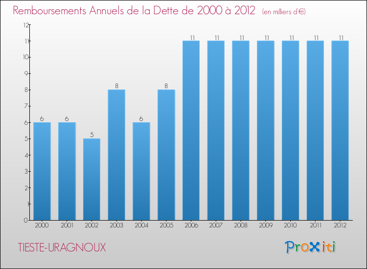 Pendant la même période, les communes françaises similaires à Tieste-Uragnoux, ont vu leur dette par habitant augmenter de 24.08 % en moyenne entre 2000 et 2012.