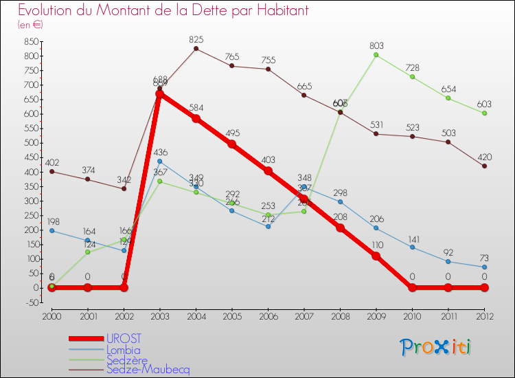Par rapport aux 63 habitants de Urost, en 2012 le poids de cette dette représente 0 € par habitant.