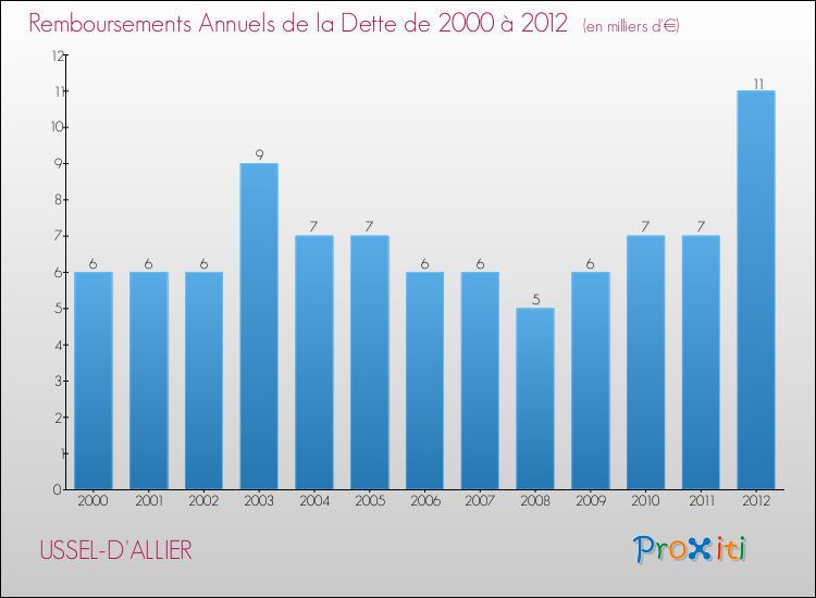 A Ussel-d'Allier, ce montant de la dette est pourtant en baisse de 9.59 % par rapport à 2011.