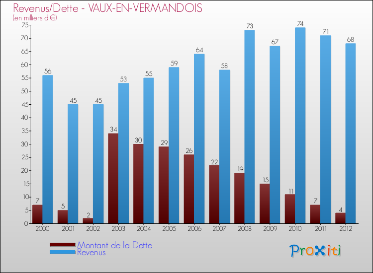 Comparaison Revenus/Dette de Vaux-en-Vermandois (de 2000 à 2012)