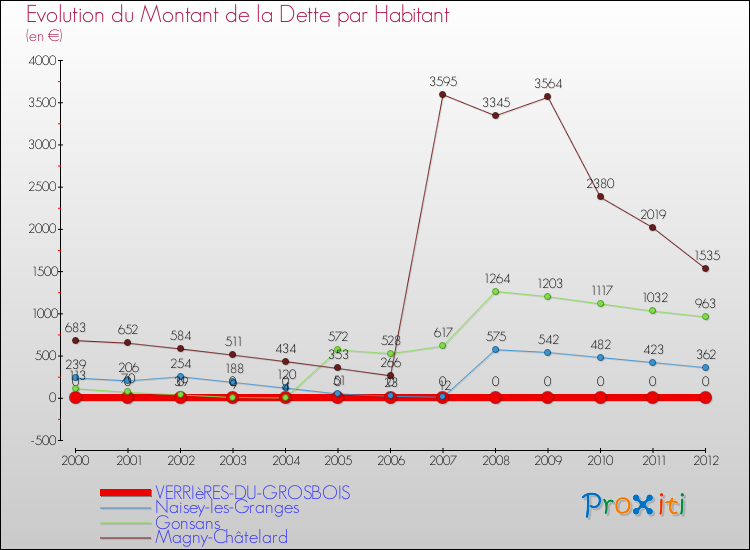 Le graphique ci-dessous représente l'évolution de la dette par habitant à Verrières-du-Grosbois depuis 2000.