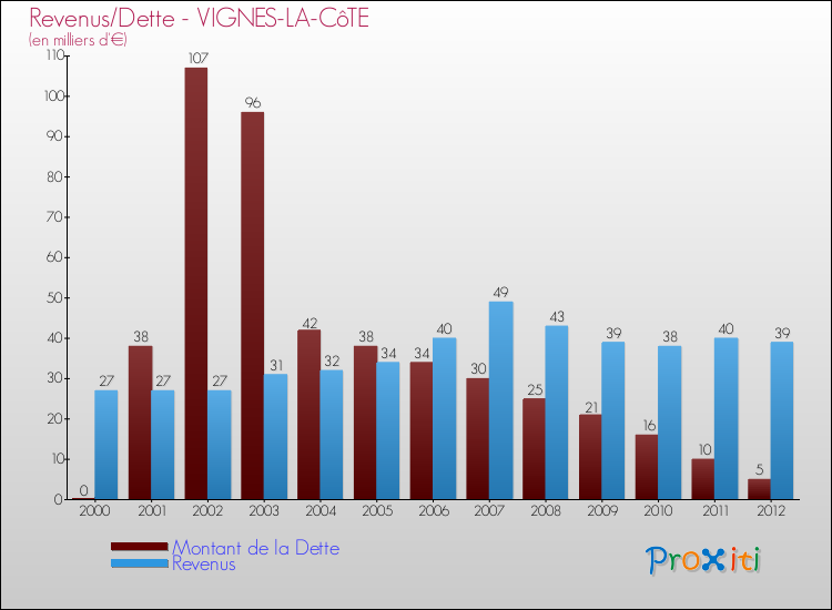 Comparaison Revenus/Dette de Vignes-la-Côte (de 2000 à 2012)