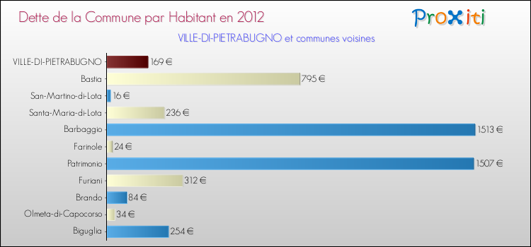 A Ville-di-Pietrabugno, la dette due par habitant de la commune en 2012 est donc moins élevée de 76.4 % que pour des communes similaires.