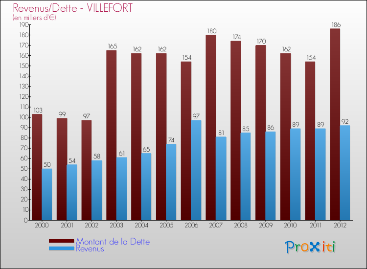 Par rapport aux 100 habitants de Villefort, en 2012 le poids de cette dette représente 1857 € par habitant.