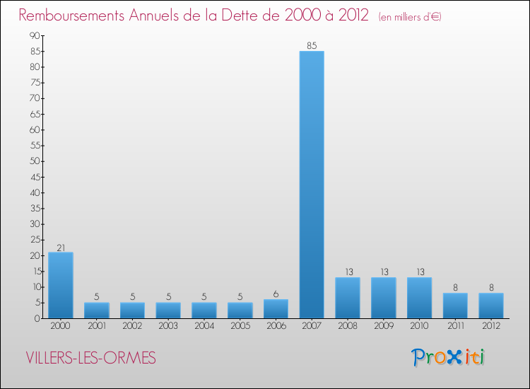 A Villers-les-Ormes, ce montant de la dette est pourtant en baisse de 3.54 % par rapport à 2011.