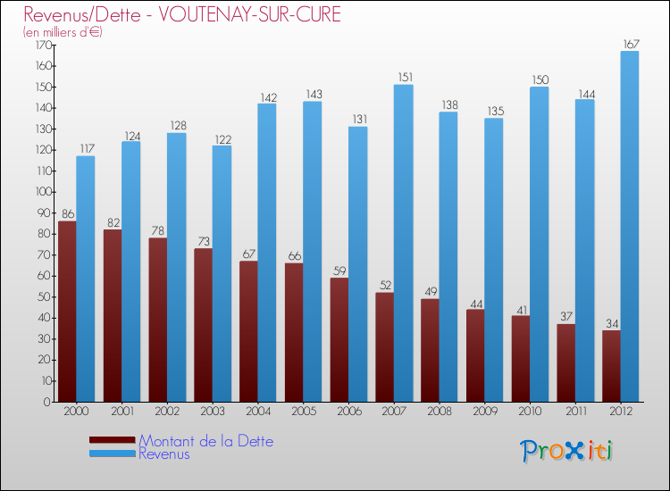 Comparaison Revenus/Dette de Voutenay-sur-Cure (de 2000 à 2012)