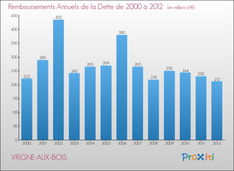 A Vrigne-aux-Bois, ce montant de la dette est en augmentation de 2.37 % par rapport à 2011.