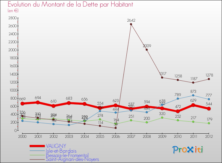 Pendant la même période, les communes françaises similaires à Valigny, ont vu leur dette par habitant augmenter de 34.96 % en moyenne entre 2000 et 2012.