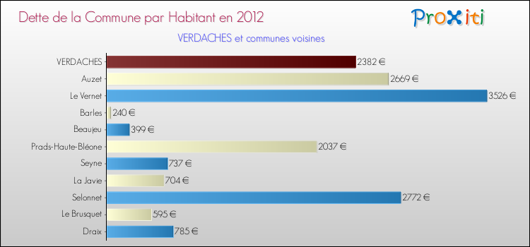 A Verdaches, la dette due par habitant de la commune en 2012 est donc plus élevée de 371.68 % que pour des communes similaires.