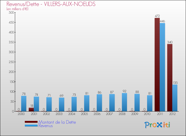Comparaison Revenus/Dette de Villers-aux-Noeuds (de 2000 à 2012)