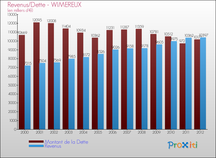 Comparaison Revenus/Dette de Wimereux (de 2000 à 2012)