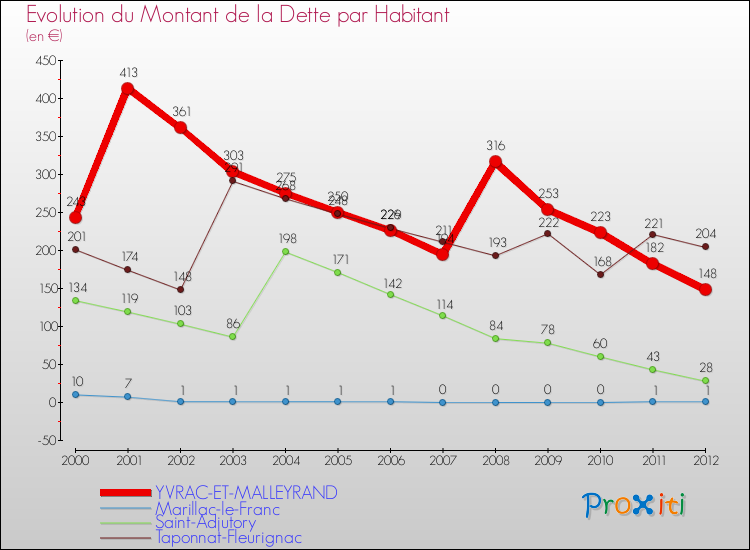 Par rapport aux 525 habitants de Yvrac-et-Malleyrand, en 2012 le poids de cette dette représente 148 € par habitant.