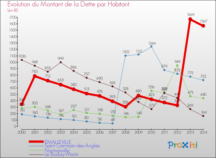 Par rapport aux 540 habitants de Émalleville, en 2014 le poids de cette dette représente 1567 € par habitant.